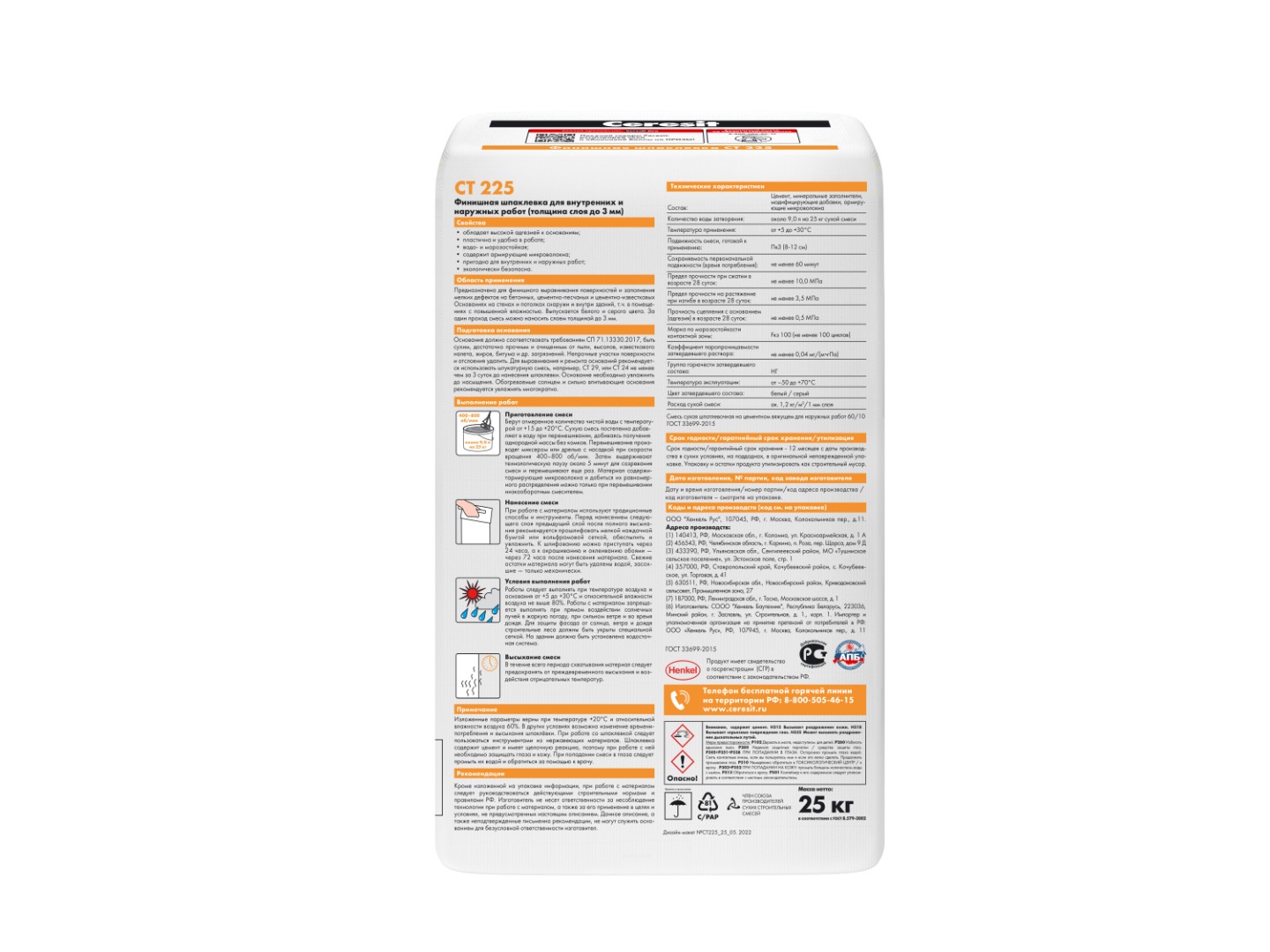 Описание товара: "Шпаклевка Ceresit СТ 225 фасадная серая (25 кг)"