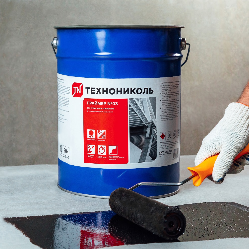 Праймер Технониколь №03 имеет широкий диапазон рабочих температур от -20°С до +40°С. Расход материала составляет 1 кг на 0,2-0,35 м2.