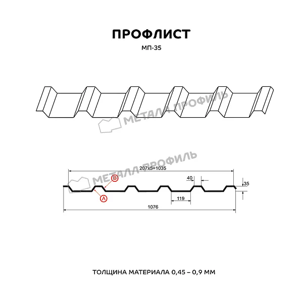 Профлист МЕТАЛЛ ПРОФИЛЬ МП-35x1035-B (ПЭ-01-6002-0,7) широко применяется для оформления профилированного листа. Представляет собой стальной оцинкованный лист с покрытием. Общая толщина стальной основы с цинковым и полимерным покрытием — 0.7 мм. Проходя процедуру холодного проката, сталь приобретает рисунок из ритмичных волн. Несущая способность такого листа на порядок выше плоского.Профиль МП-35: