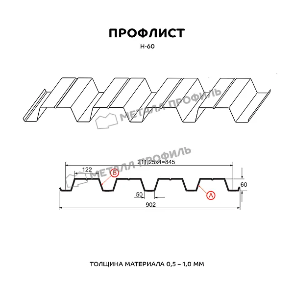 Профлист МЕТАЛЛ ПРОФИЛЬ Н-60x845-A (ПЭ-01-6005-0,7) часто используется для оформления профилированного листа. Представляет собой лист оцинкованной стали с покрытием. Общая толщина стальной основы с оцинковкой и полимерным покрытием составляет 0.7 мм. Проходя процедуру холодного проката, сталь приобретает рисунок из повторяющихся волн. Такая конфигурация придает профилю жёсткость.